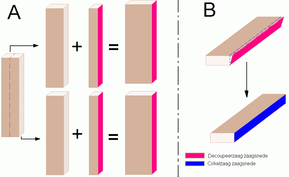 In schema 1 (klik hier voor het schema) is te zien wat er is gebeurd. Tijdens proces A werd de zijkant gemaakt. De rode zijde is de zijde waar ik met de decoupeerzaag heb gezaagd en die dus scheef was. Tijdens proces B is dit weer hersteld en is het allemaal mooi recht gemaakt. Op de foto zie je de achterkant die nu dus precies passend is. Hmmmm Lekker!