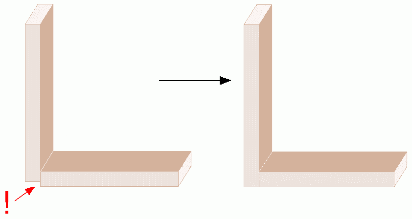 Nu is de achterkant wel mooi recht, maar dat was nog niet alles. Neen! Bij de hoek linksonder waar twee van de vier zijkanten elkaar raken, past het allemaal niet lekker. (zie ook schema 2 voor meer info. (Klik hier voor het schema) De zijde die tevens de onderkant van het Cd-rek vormt moet dus recht worden getrokken. Het is niet zo dat het binnenwerk te groot is, maar het moet allemaal gewoon even lekker stevig op elkaar gedrukt worden, worden voorzien van deuvels en daarna gelijmd.